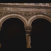 - EN church (building), arches, cornice components, columns (architectural elements), bas-relief (sculpture), mosaics (visual works)