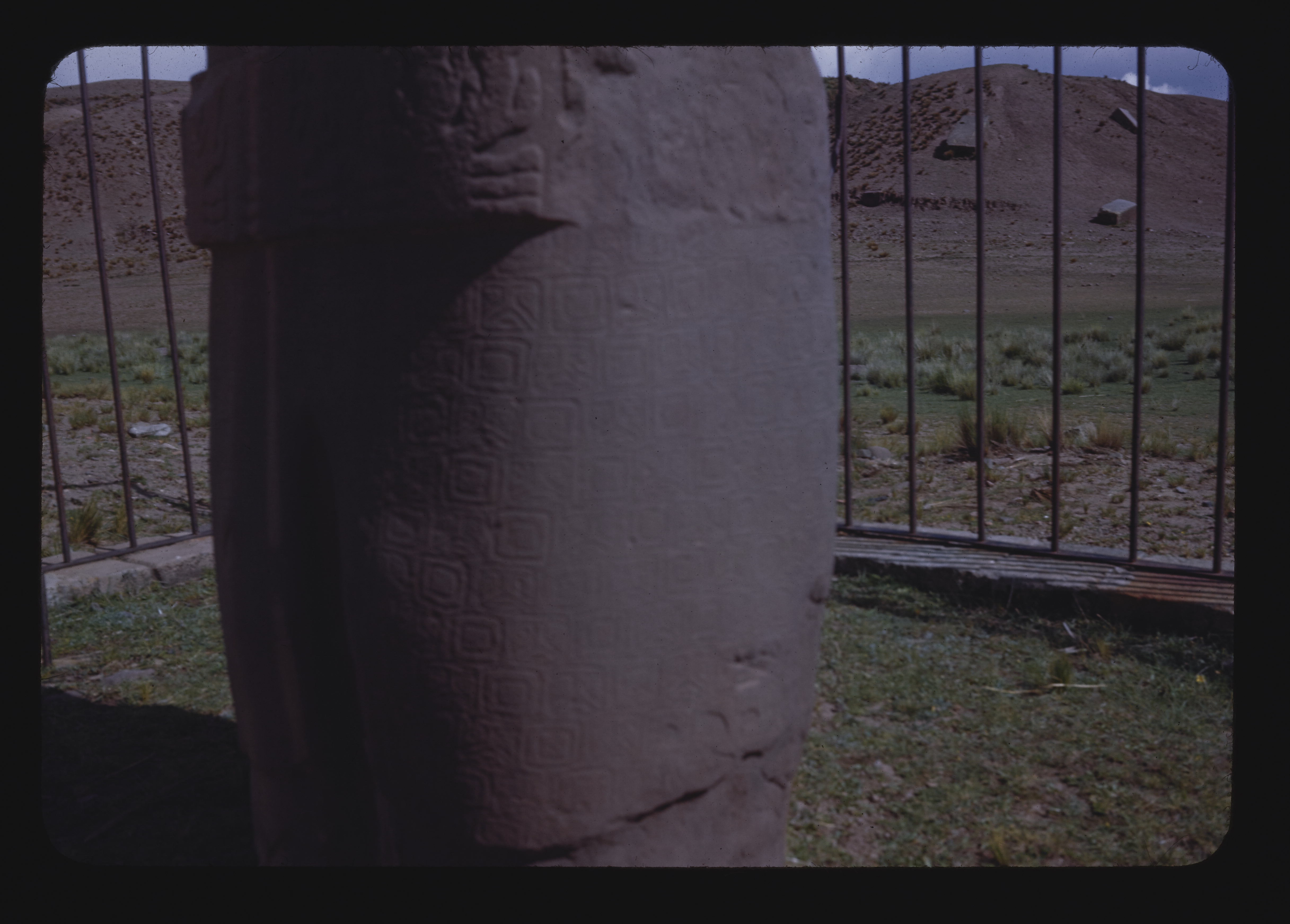 - EN Archeology - Pre-Columbian Tiahuanaco Detail of Carving of Man Carved Checkerboard Design Suggests Pattern of Tiahuanaco Textiles Color 17-2