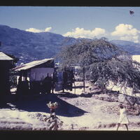 - EN buildings (structures), roofs, trees (woody plants), mountains (landforms), anonymous people, clouds