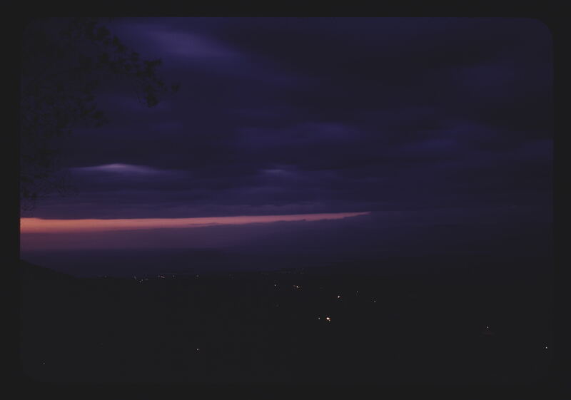 - EN mountains (landforms), hills (landforms), trees (woody plants), clouds, sunset