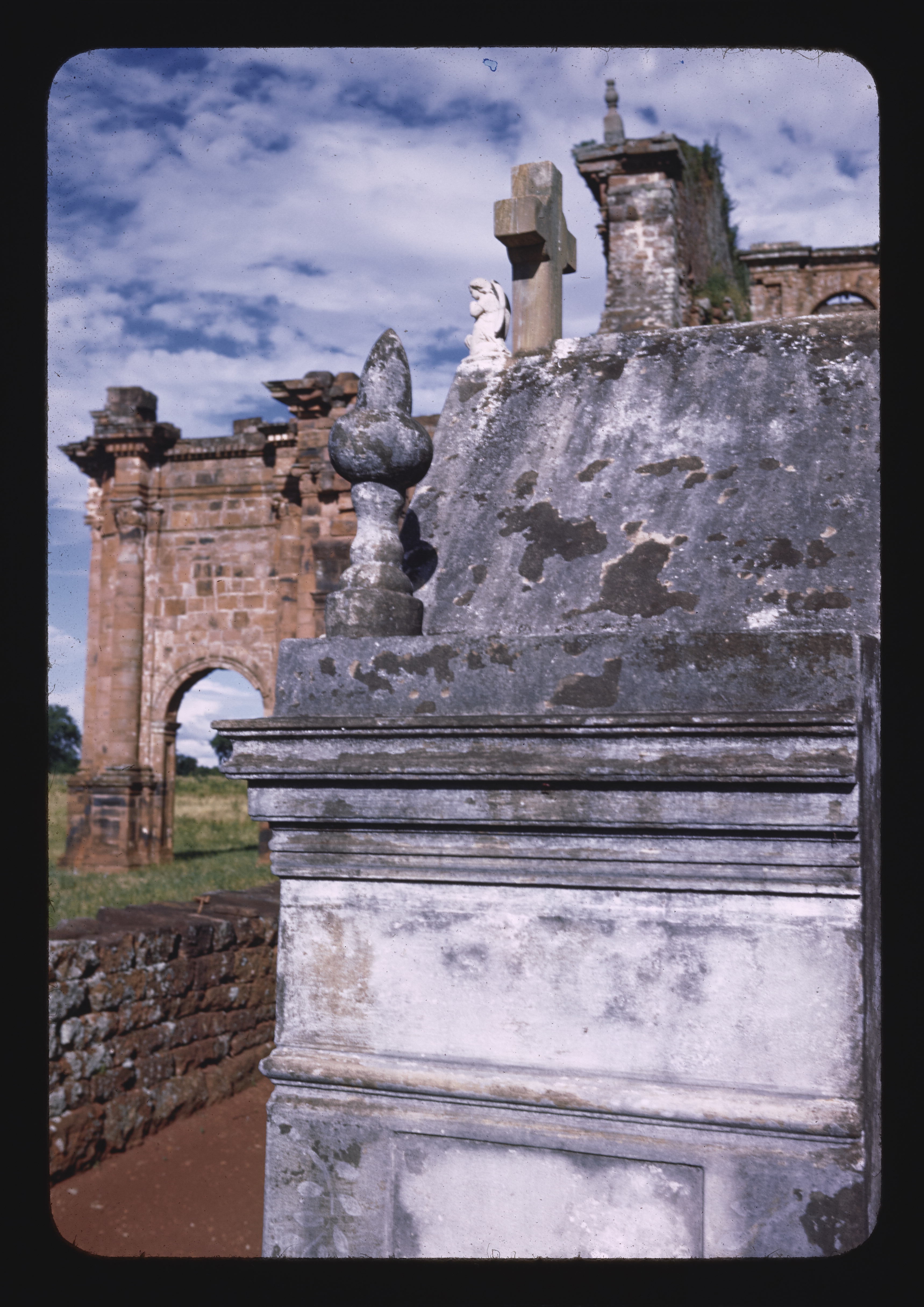 - PT cruzes (obras visuais), arcos, ruínas, paredes (alvenaria), núvens, Plantae (reino), gramas (plantas), Plantae (reino), árvores (plantas lenhosas)
