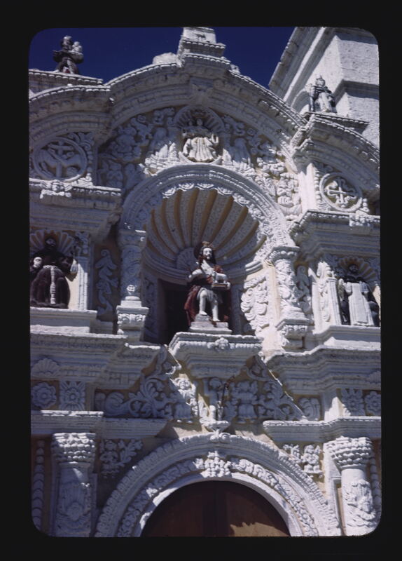 - EN Arequipa Yanahuara Church of San Juan de Bautista Main facade Upper section Sculpture of St. John the Baptist Bas relief of the Virgin of the Rosary