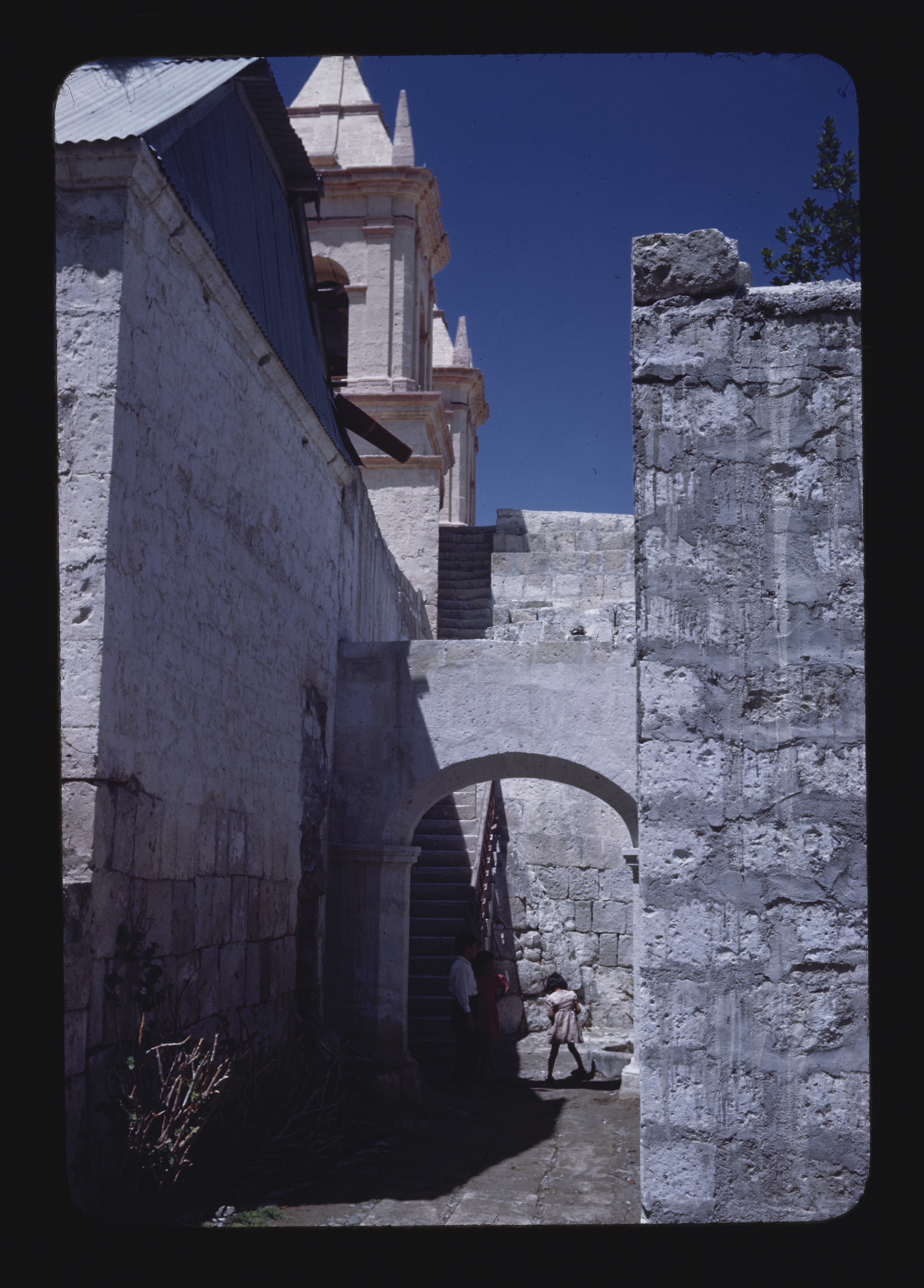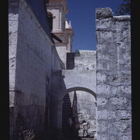 - EN Arequipa Cayma Church of San Miguel Exterior corridor Stair leading to roof