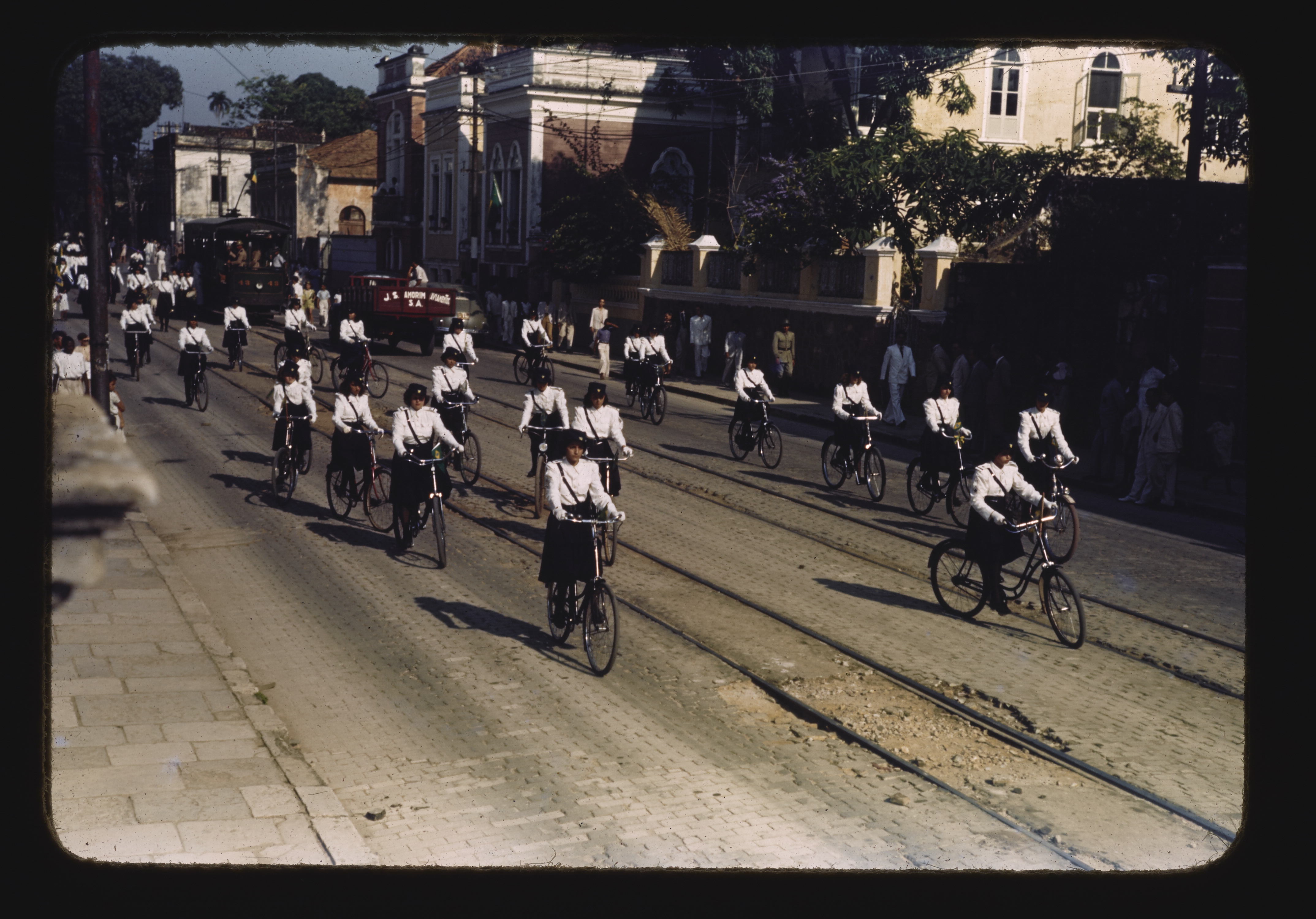 - ES desfiles, personas anónimas, edificios, árbol, calles, bicicletas