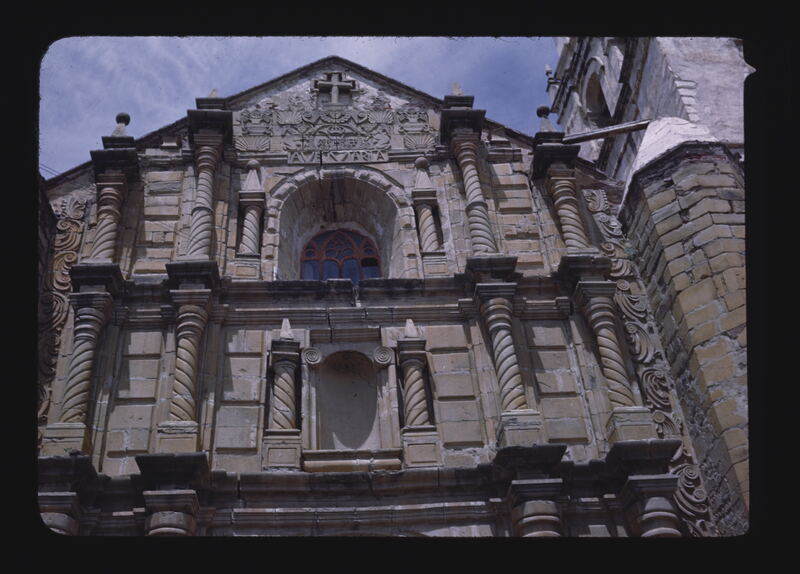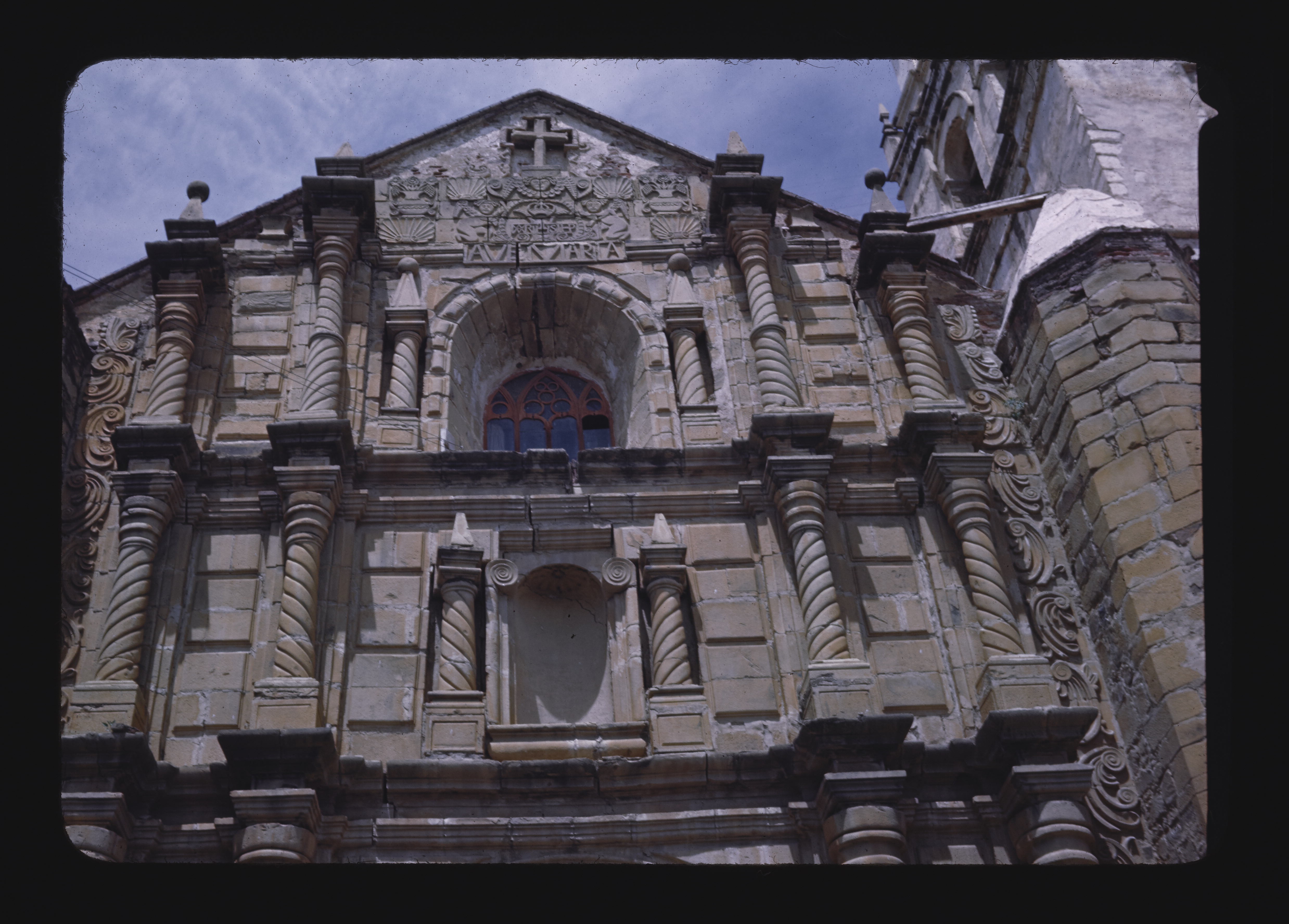 - ES componentes de cornisa, columnas (elemento arquitectónico), tallas (escultura), ventanas de tracería abierta, piedra de construcción