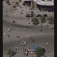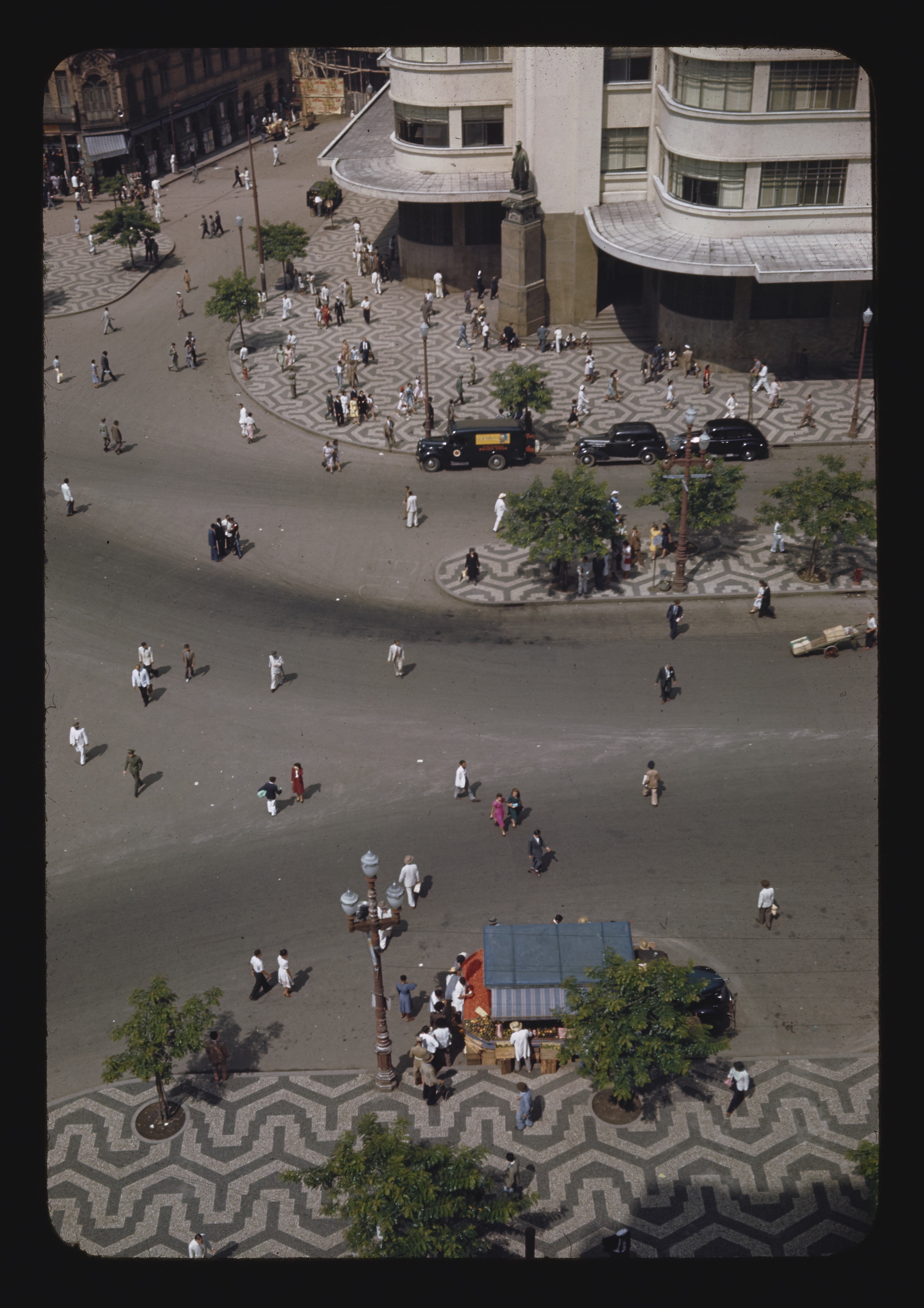 - EN buildings (structures), streets, pedestrians, automobiles, sidewalks, mosaics (visual works), trees (woody plants)