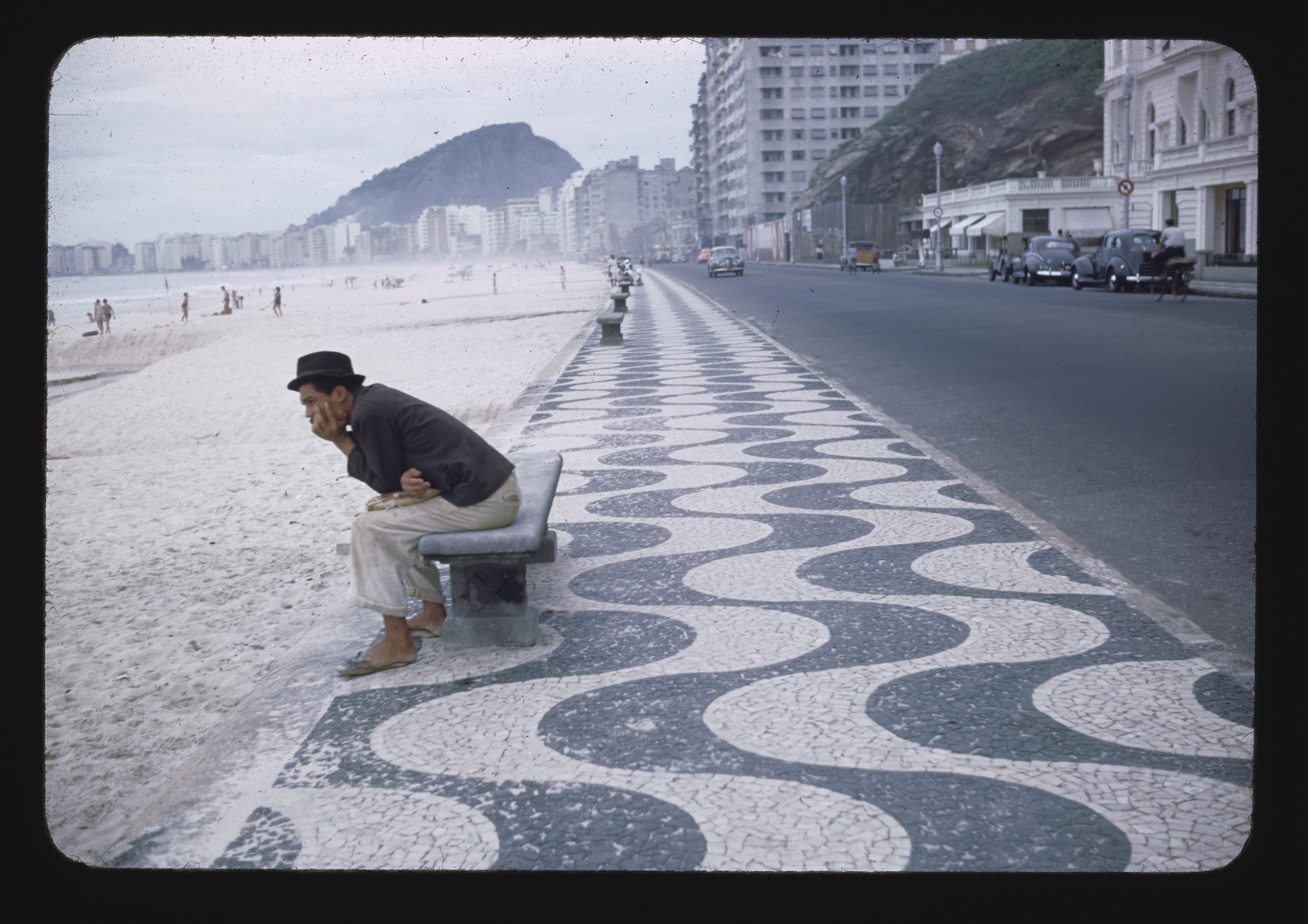 - EN beaches, anonymous people, waterfronts, streets, automobiles, buildings (structures), sidewalks, mosaics (visual works), benches (furniture)