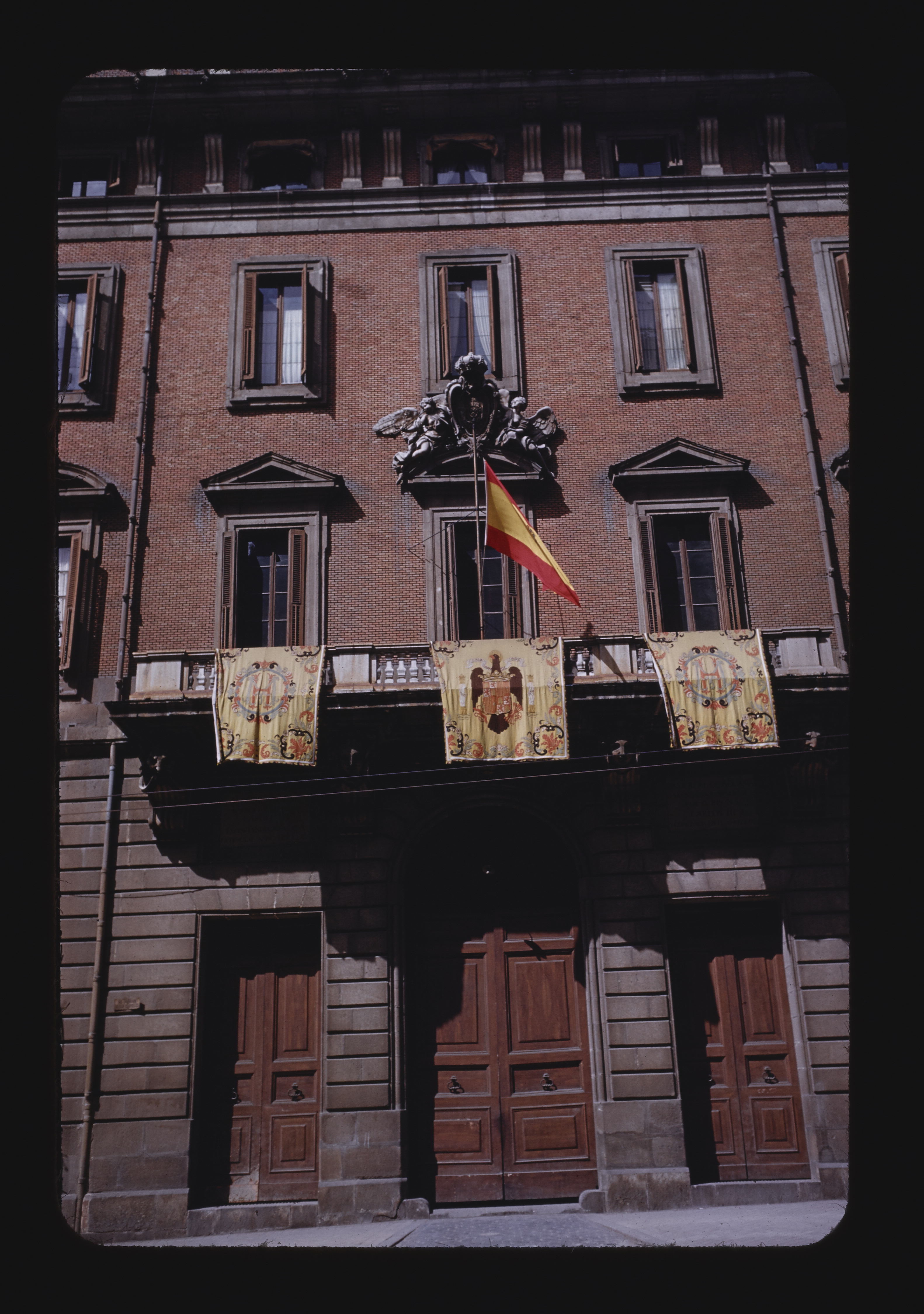 - EN buildings (structures), entrances, window components, cornice components, balconies, French doors, flags, brick (clay material), accordion shutters, architectural ornament, pediments