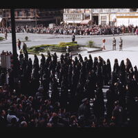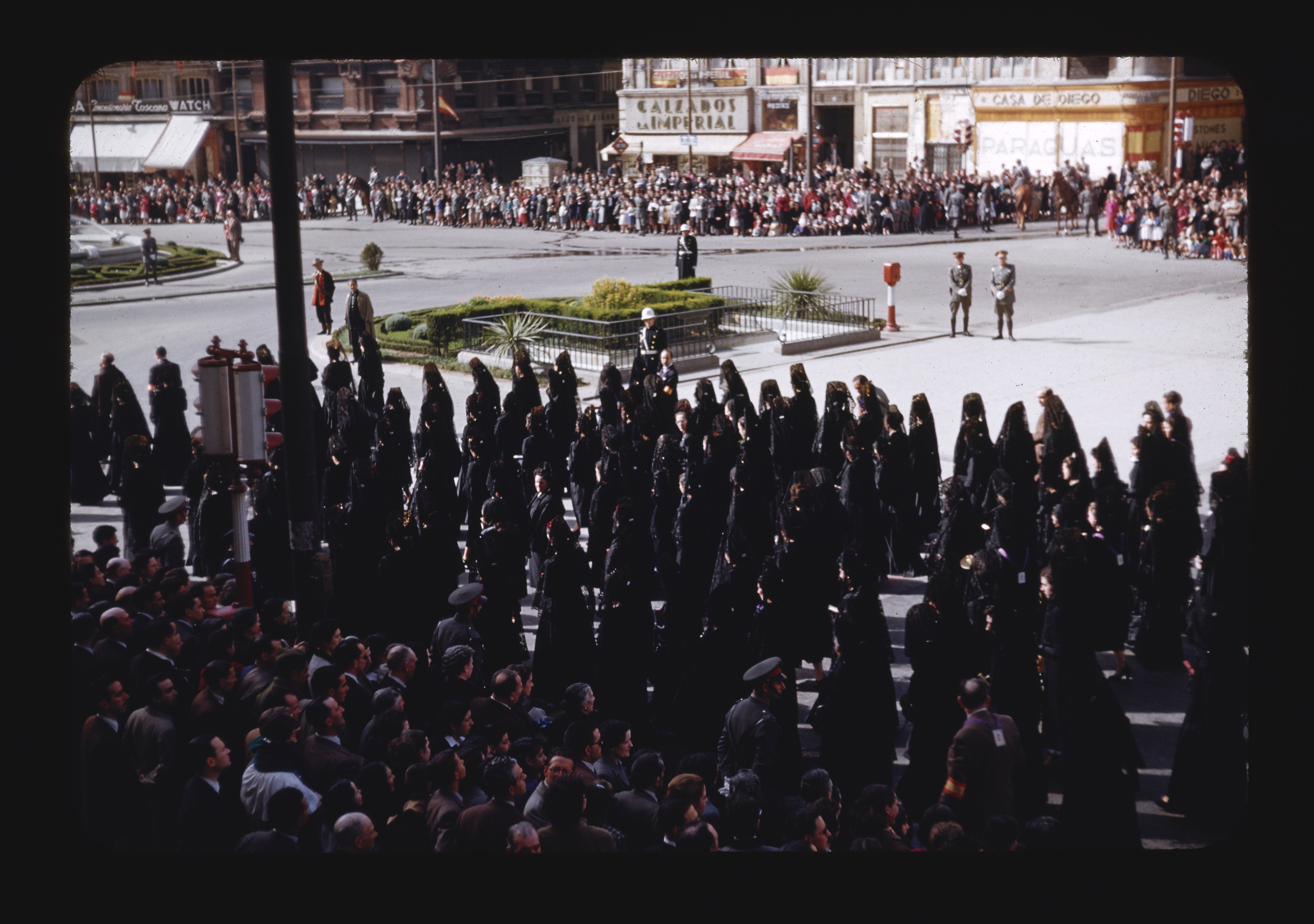 - ES procesiones, personas anónimas, toldos, edificios, balcones, banderas, fuente de agua, arbustos