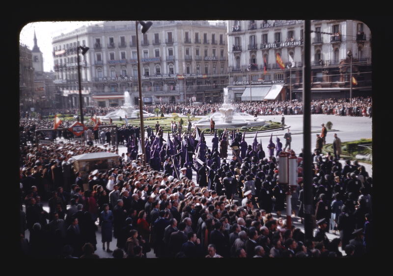 - ES procesiones, personas anónimas, toldos, edificios, balcones, banderas, fuente de agua, arbustos, luces de tráfico