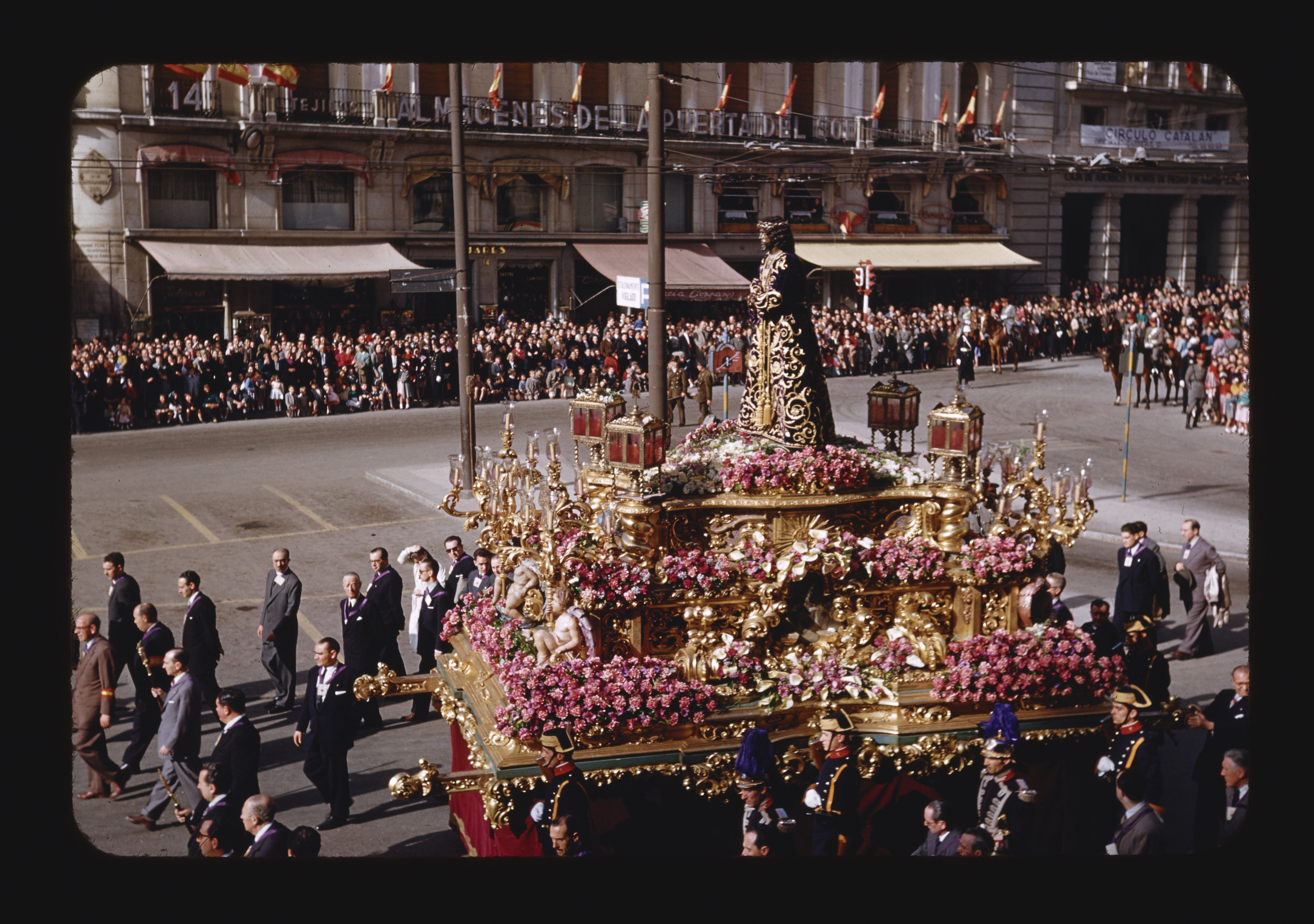 - ES procesiones, personas anónimas, carros alegóricos (vehículo), toldos, balcones, banderas