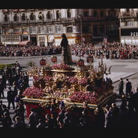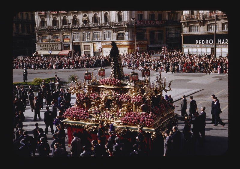 - ES procesiones, personas anónimas, carros alegóricos (vehículo), toldos, balcones, banderas, arcos, luces de tráfico