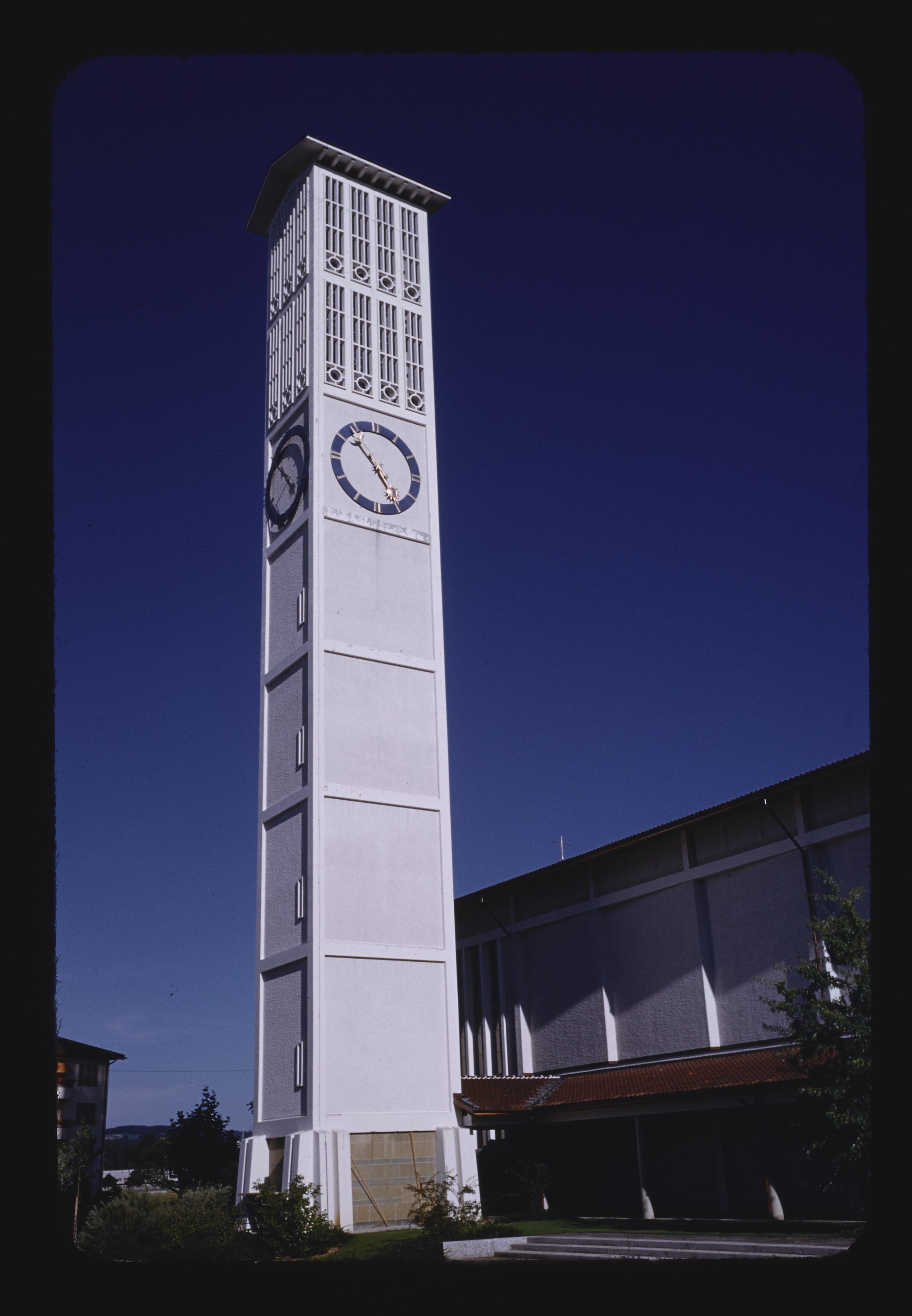 - EN churches (buildings), buildings (structures), windows, Plantae (kingdom), trees (woody plants), clouds, campaniles