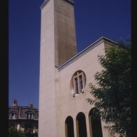 - EN churches (buildings), buildings (structures), windows, Plantae (kingdom), trees (woody plants), campaniles, arches