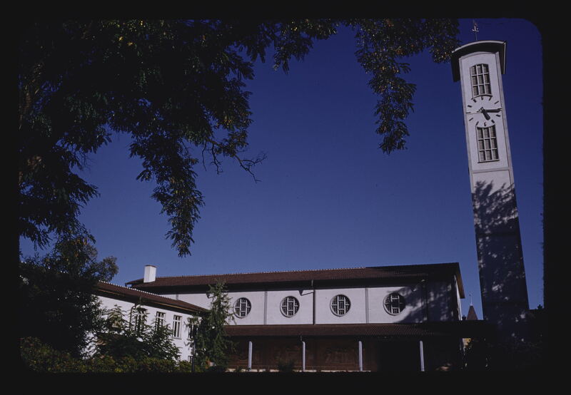 - EN churches (buildings), buildings (structures), windows, Plantae (kingdom), trees (woody plants), campaniles, columns (architectural elements)