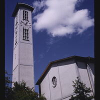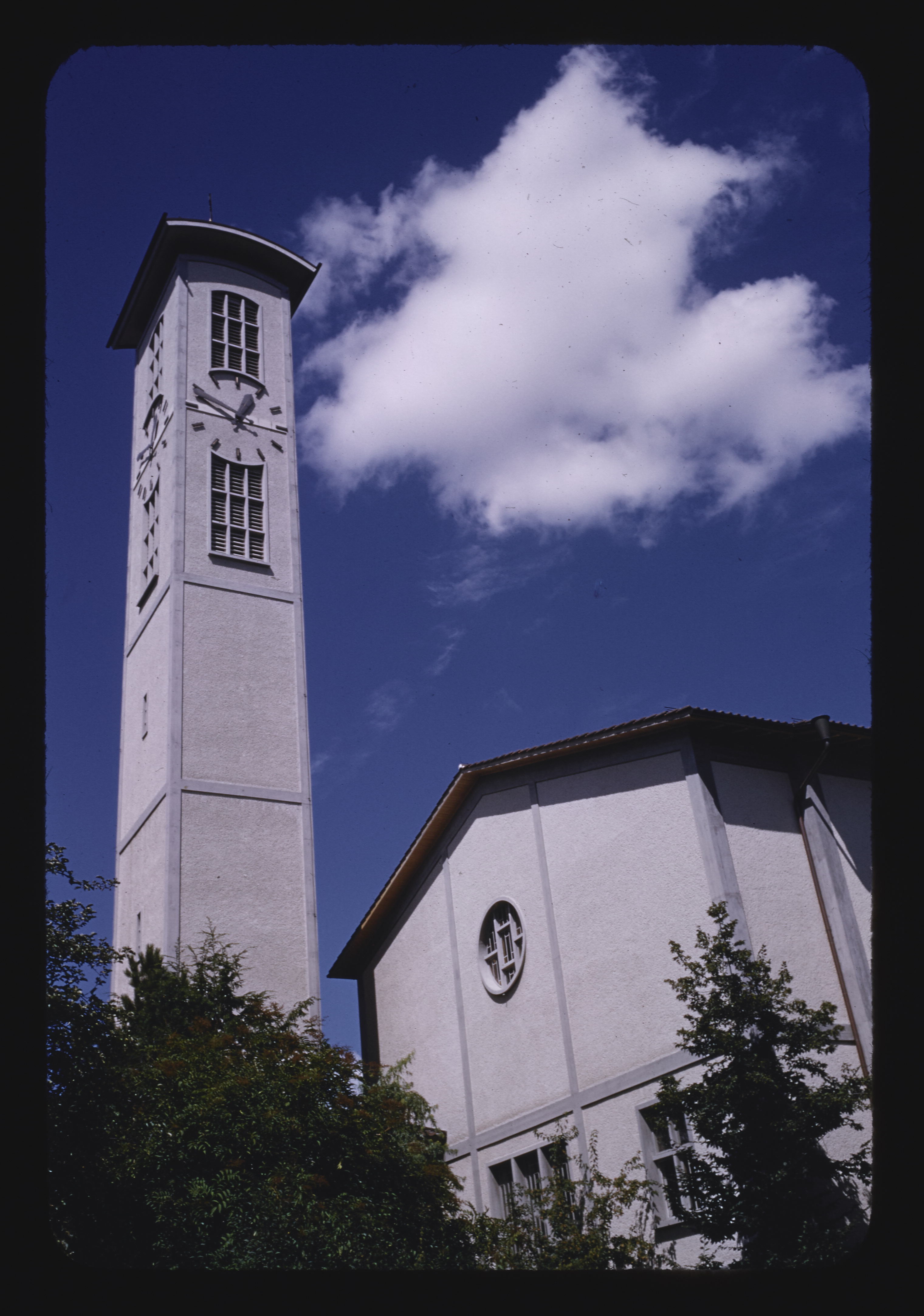 - EN churches (buildings), buildings (structures), windows, trees (woody plants), Plantae (kingdom), campaniles, clouds
