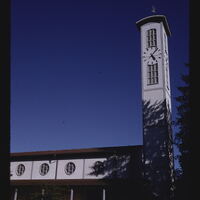 - EN churches (buildings), buildings (structures), windows, trees (woody plants), Plantae (kingdom), campaniles