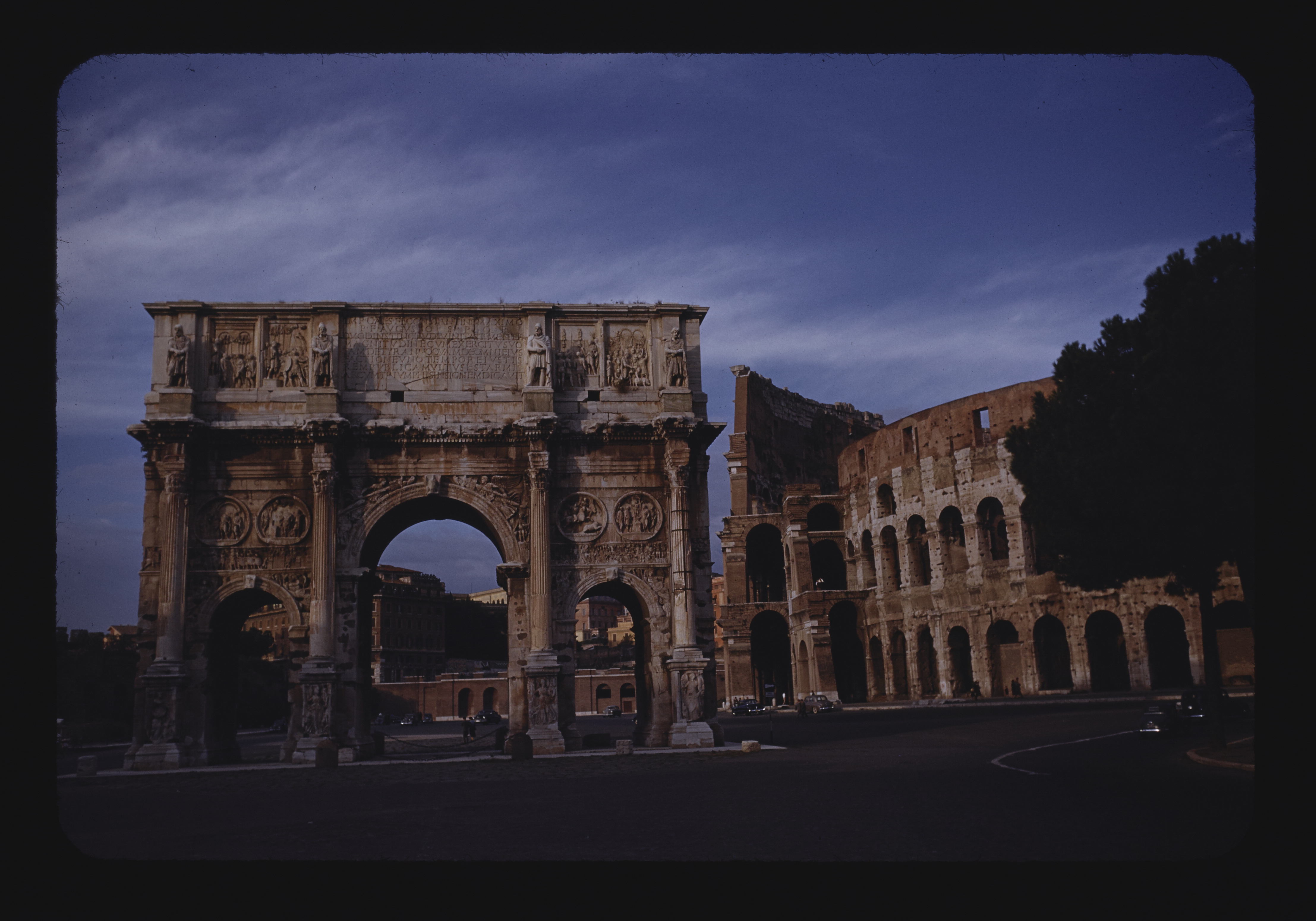 - EN Rome Colosseum or Flavian Amphitheatre 72 A.D. Foreground Arch of Constantine ca. 312 A.D.