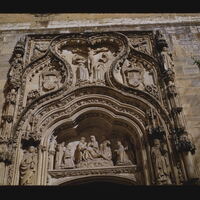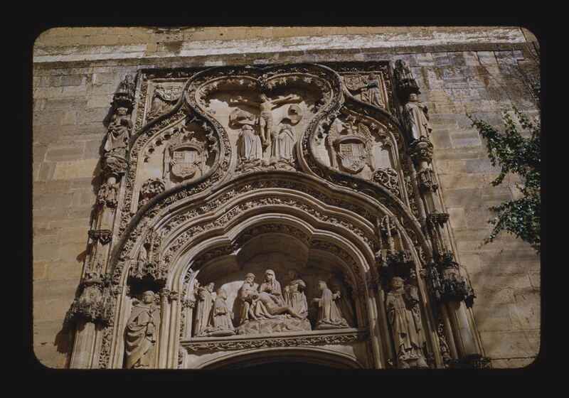 - EN Segovia Santa Cruz Main portal 16th Century Tympanum Relief of the Pieta Flanking statues of Ferdinand and Isabella Relief of the Crucifixion