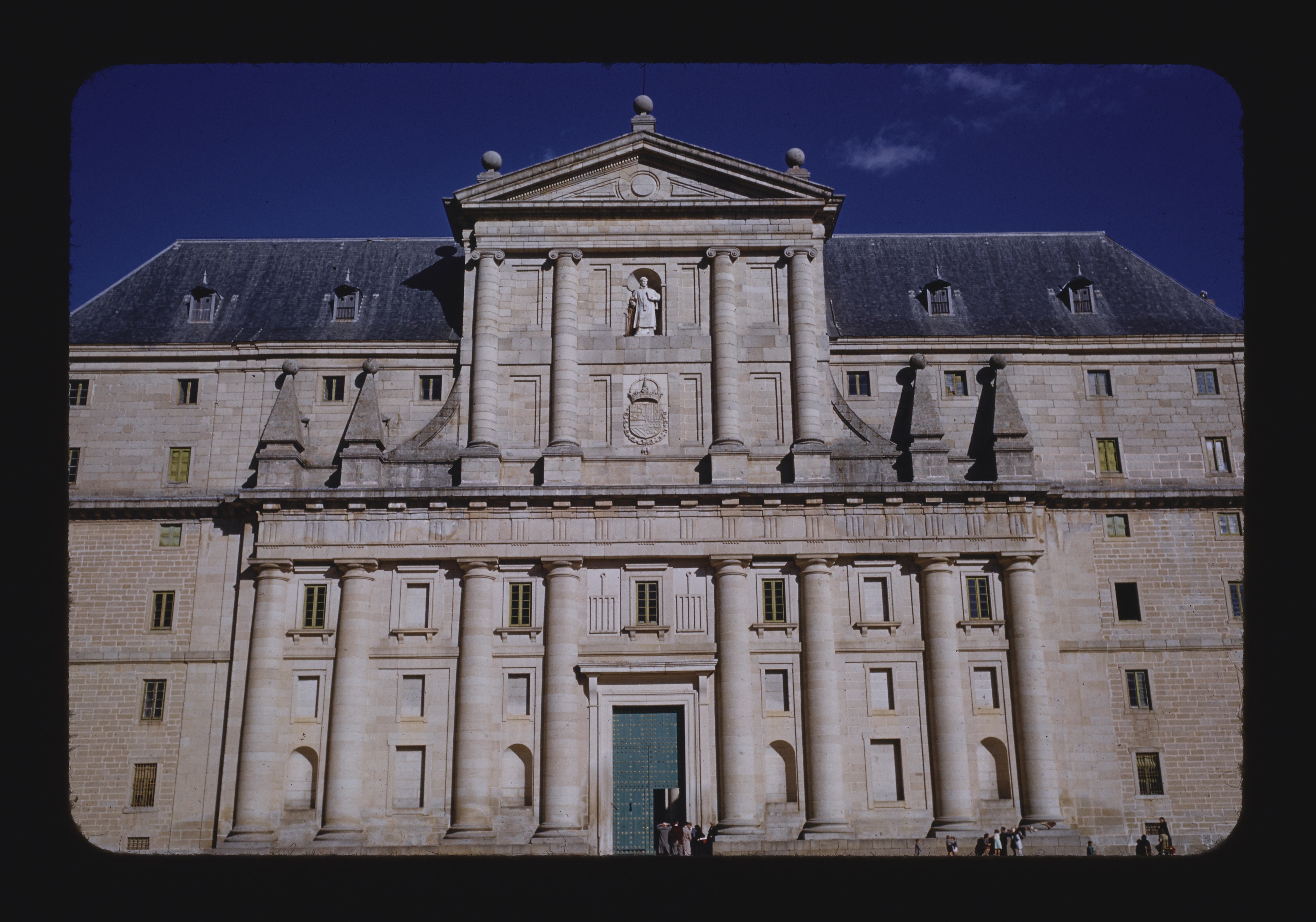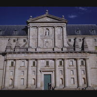- EN El Escorial West (main) facade Center (main) portal Doric columns Statue of St. Lawrence by J.B. Monegro Arms of Philip II General view