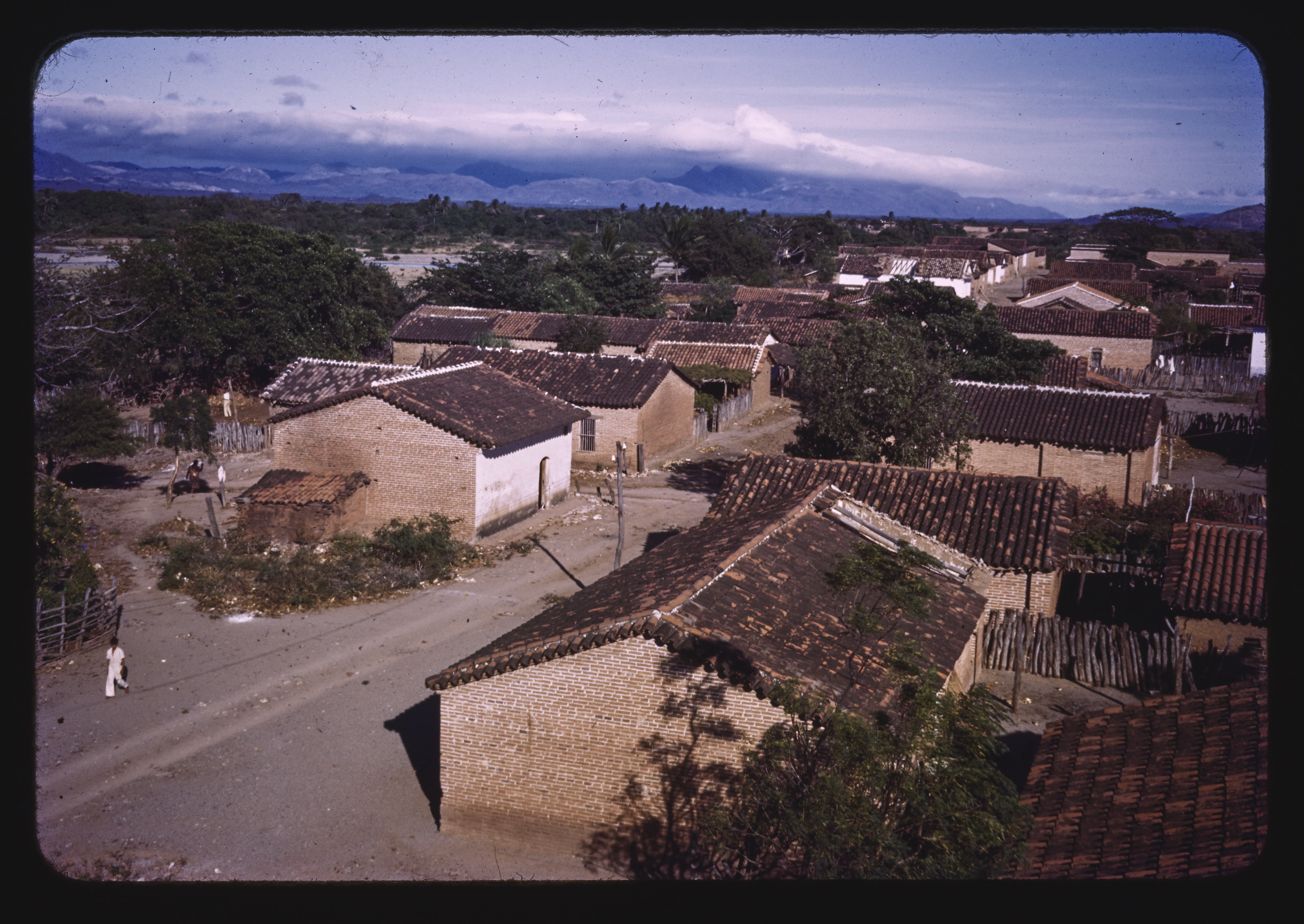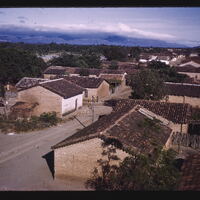 - EN mountain ranges, roofing tile, gable roofs, cityscapes (representations), trees (woody plants), dirt roads