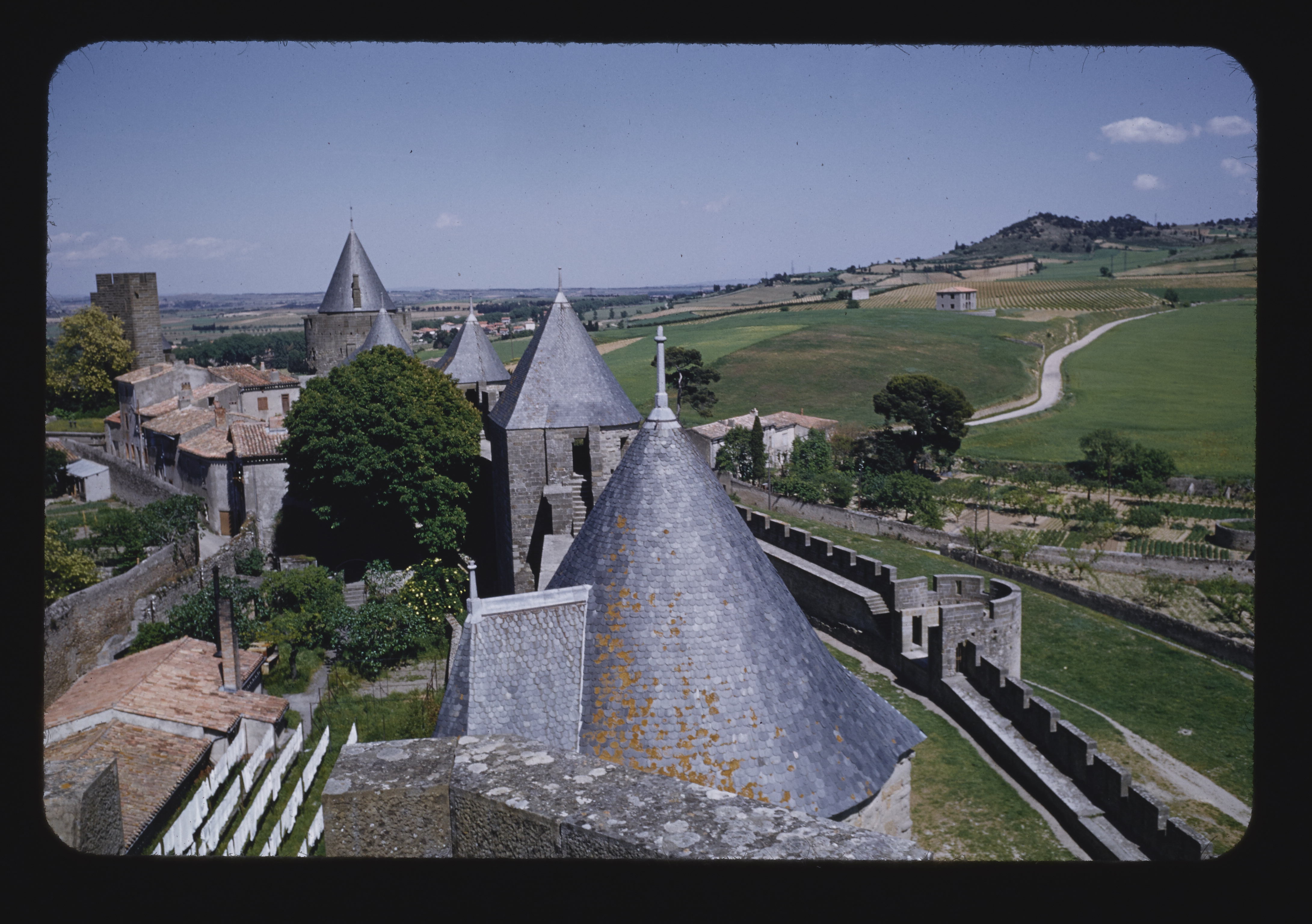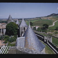 - EN Cities Carcassonne La Cité Castle roofs Fortified walls View of countryside