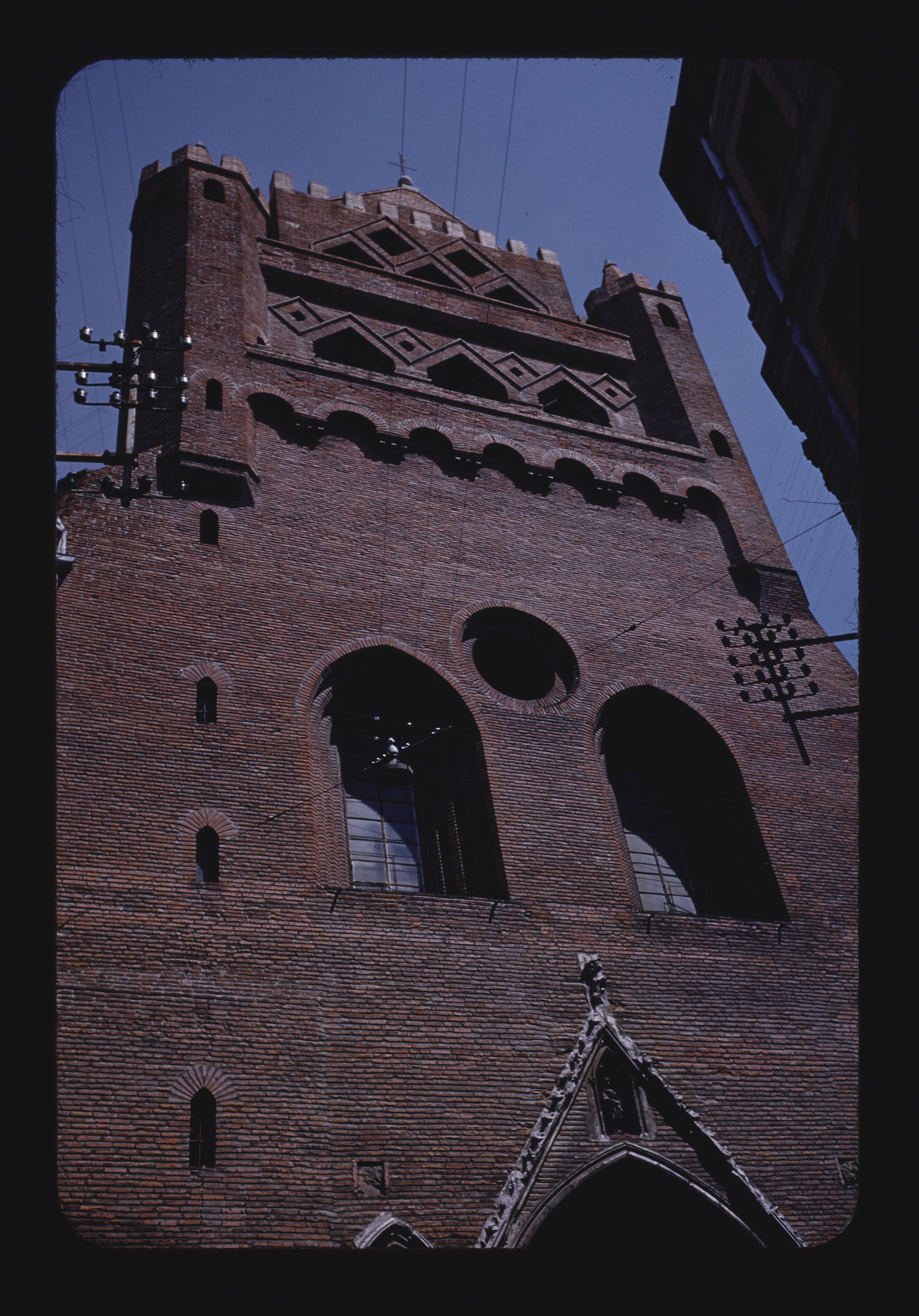 - EN church (building), brick (clay material), blind arches, pointed arches, cornice components, electric lines, parapet