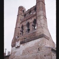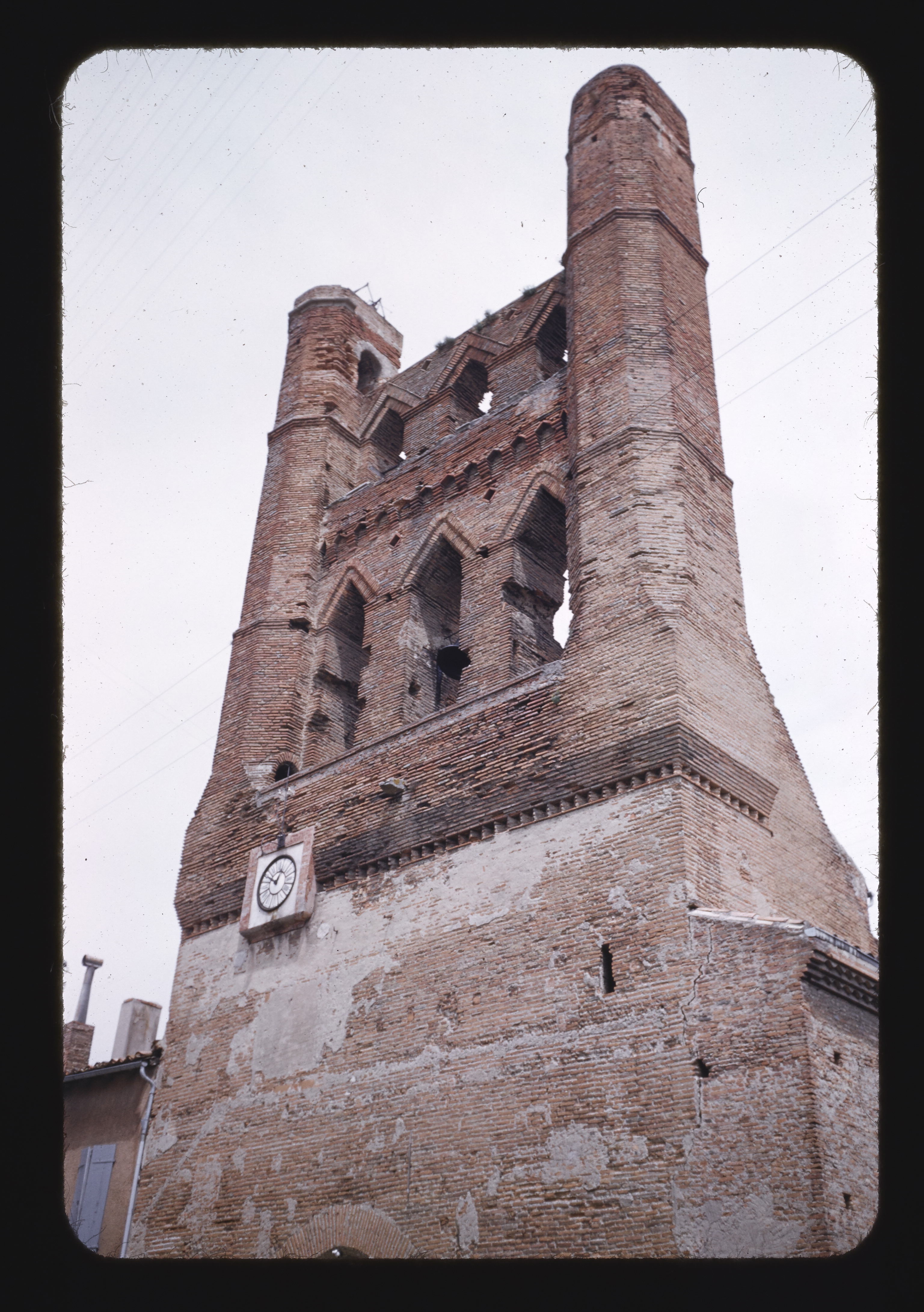 - EN Churches Avignonet Romanesque church Main facade Upper section Belfry 14th century