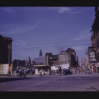 - EN buildings (structures), streets, anonymous people, windows, clouds, automobiles