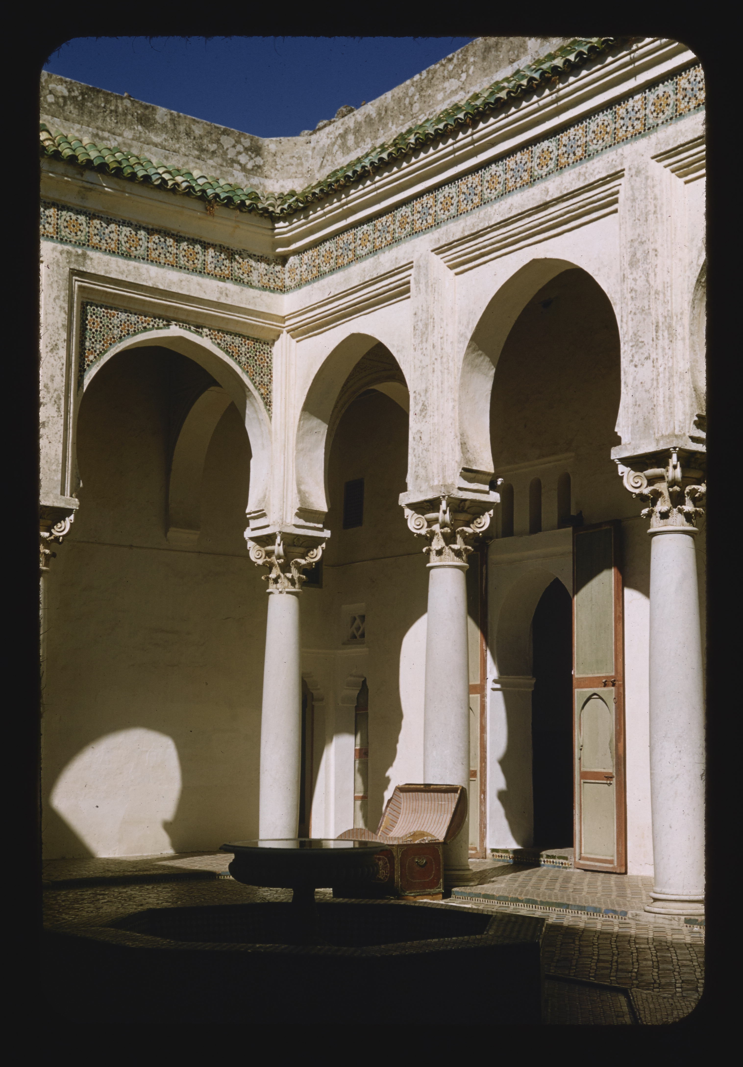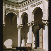 - EN courtyard, horseshoe arches, columns (architectural elements) , roof tile, mosaic (visual work)