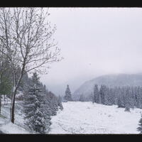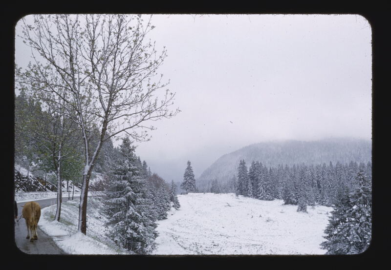- EN snow (precipitation), trees (woody plants), mountain range, pine (genus), road