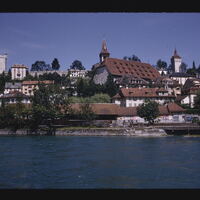 - EN river, waterfront, buildings (structures), window components, trees (woody plants), spires, gable roofs, towers (building divisions), footbridge