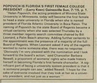 Popovich Presidency Announcement An article from the Atlantic Sun, FAU's student-run newspaper, announcing the election of Dr. Helen Popovich as FAU's third president.