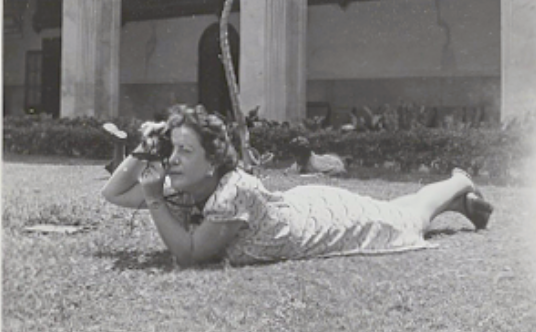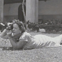 - Photograph of Florence Arquin lying on the ground while taking a photograph.