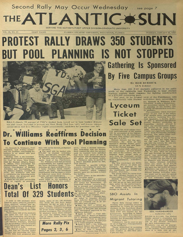 Since the inauguration of Florida Atlantic University in 1964, students have freely shared their thoughts and opinions with the intention of improving their local community and society at large. Protests and various other forms of activism, such as panels, lectures, and petitions, helped to inspire students to engage with discourse, giving them a sense of participation and forming a caring campus culture. This page of the Owls Rise: FAU Histories of Activism and Protests discusses some of FAU’s earliest forms of protesting and activism throughout the school’s first ten years. To this end, sources from the school’s student-led newspaper, The Atlantic Sun, will be investigated, as it has been capturing the students’ perspectives on these events since it started printing in 1966. During the 1960s and 1970s, United States’ citizens faced some of the nation’s greatest political and societal issues, leading to events such as civil rights movements and the rise of environmentalism. By relying on protests and activism, citizens risked their personal safety to more convincingly articulate their grievances and advocate for those in power to address their misgivings. Similarly, societal issues were experienced on campus at FAU, as students encountered events such as misappropriations of school resources, restrictions on campus activities, and local recognition of civil injustices. Although articles pertaining to students’ political involvement at FAU are scarce, these four sources show that FAU has a history of social activism from its inception. These sources depict the value students have always placed on campus community, especially at FAU.